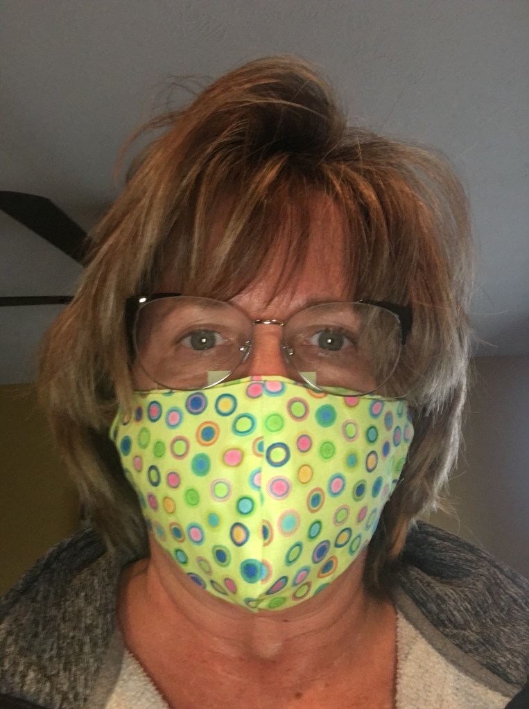 I see it all around: people rising up to help others whether it be organizing a sign-up, radio stations reminding us to choose joy, Facebook posts of favorite Bible verses, and then photos of people helping others. Another person has created a site where you can upload a picture of thanks to health care professionals working so hard to help those affected by the virus. But I think my favorite one is of my sister-in-law wearing her created mask.