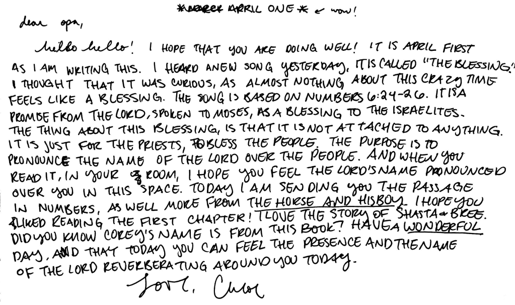 In the midst of it, Chloe is making letter writing to my father as part of her daily routine. I find it in my inbox every day– letter for Opa– and then forward it to Kellie, the director. It’s a reminder to reach out to those who are by themselves. I hope that the virus will remind us to be more intentional and reach out to those most vulnerable. Here is one part of her letter.